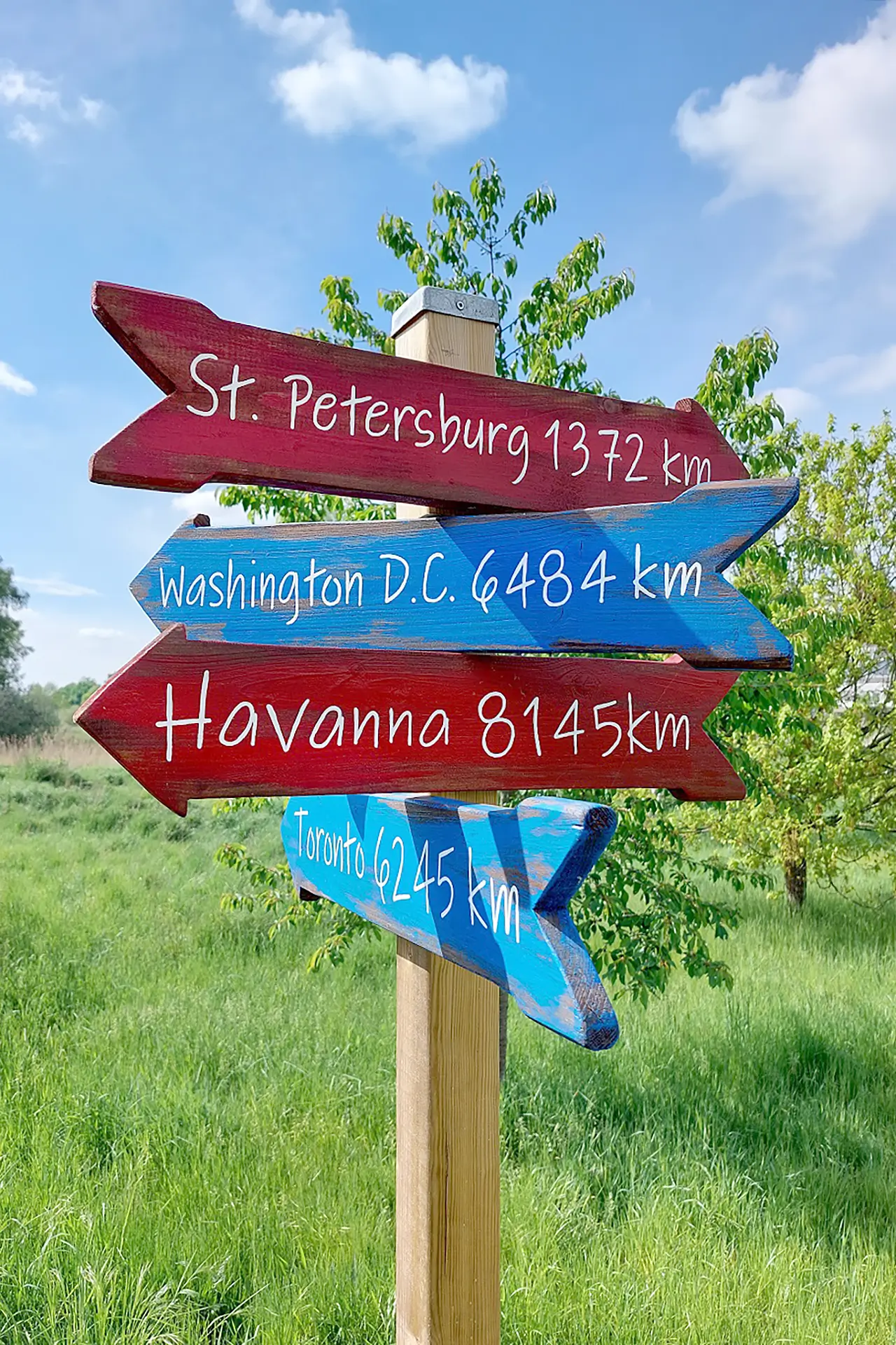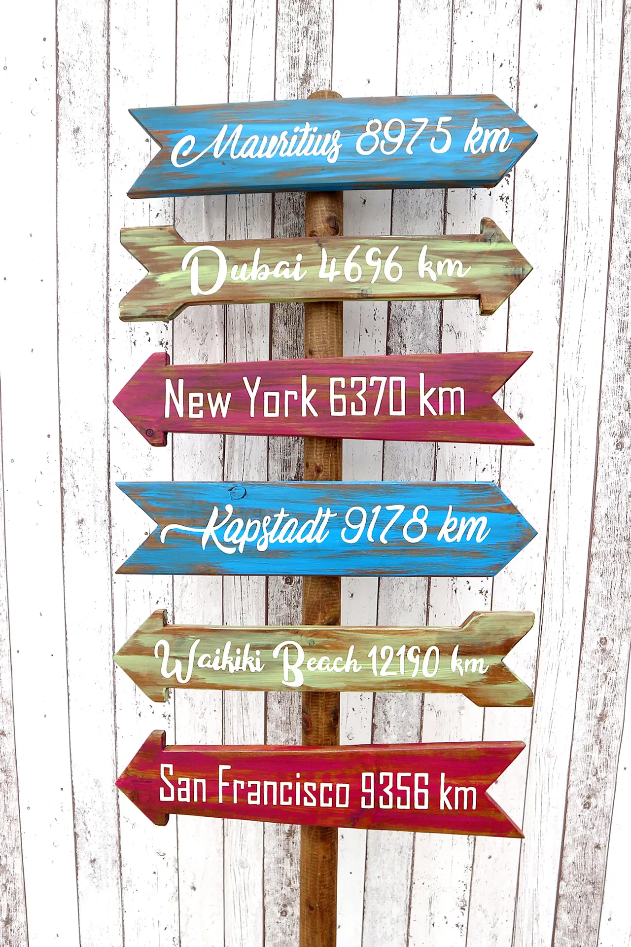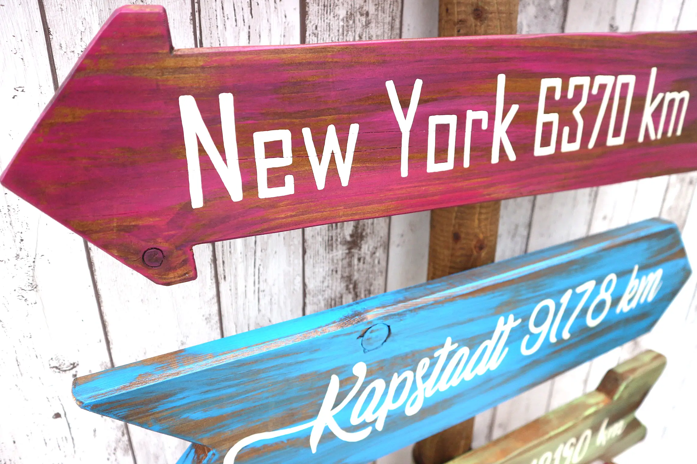 Liebevoll gestaltete Wegweiser aus nachhaltigem Holz: Handgemacht, wetterfest und für jeden Anlass der passende Blickfang.